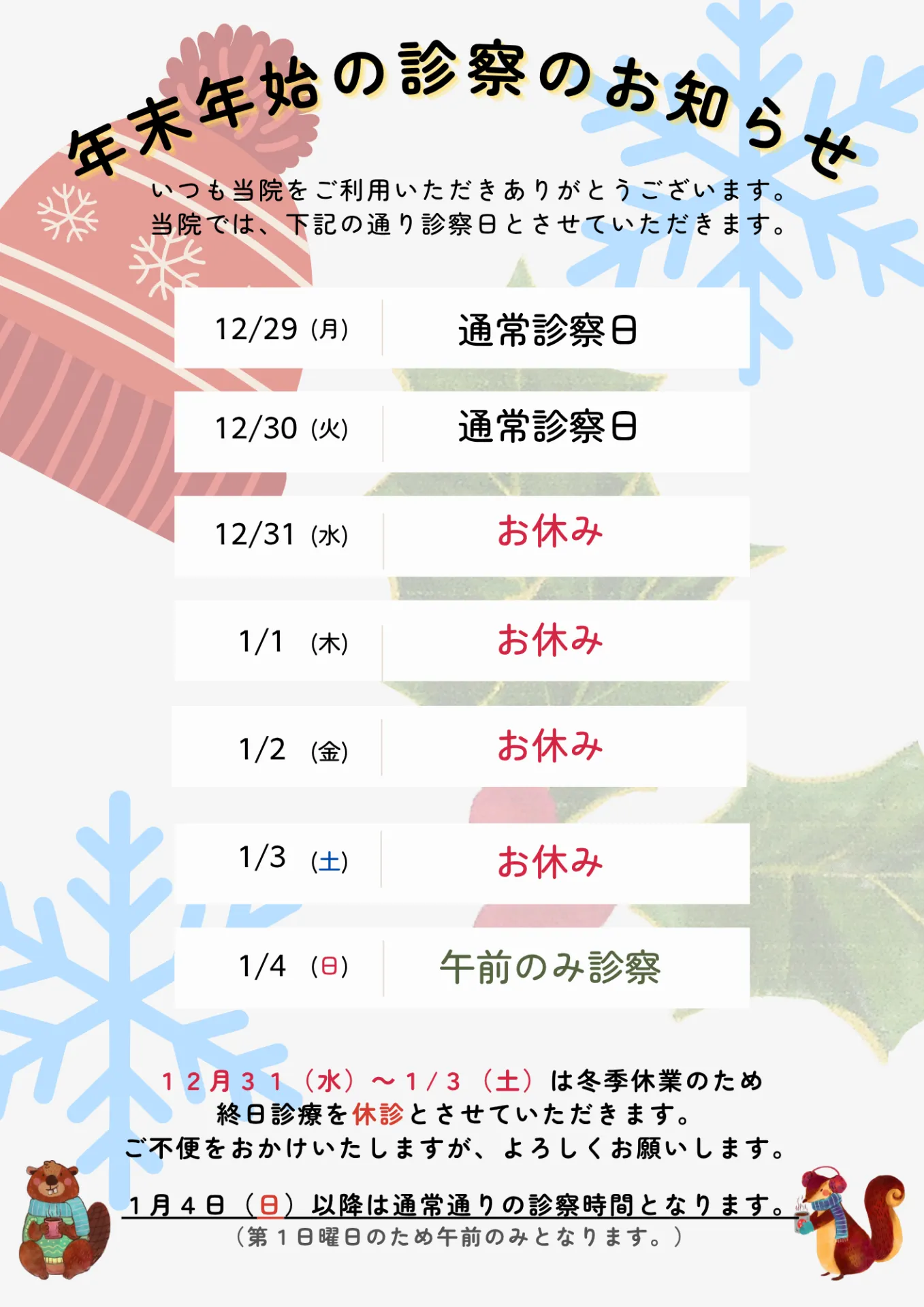 12月 診察日カレンダー