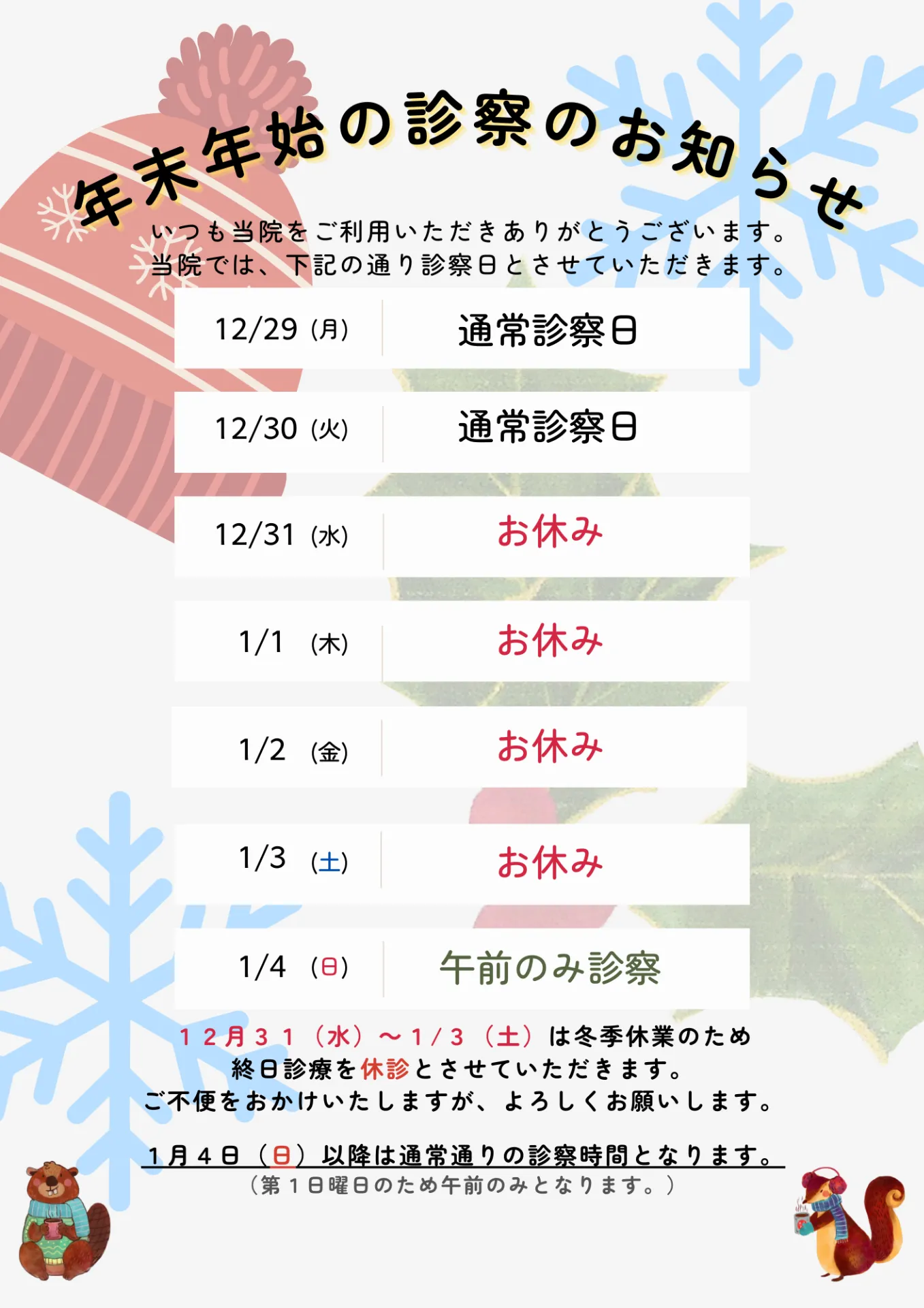12月 診察日カレンダー