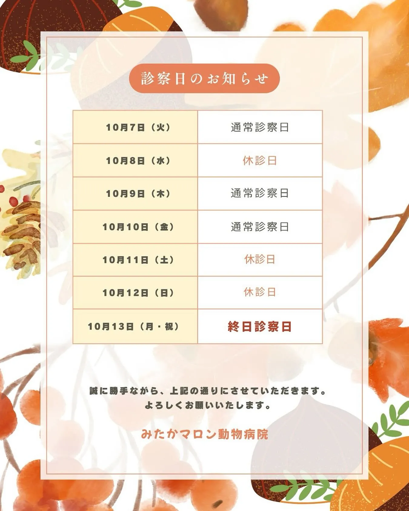 土曜がお休みの代わりに、13日(月)は祝日ですが診察日となります🙌